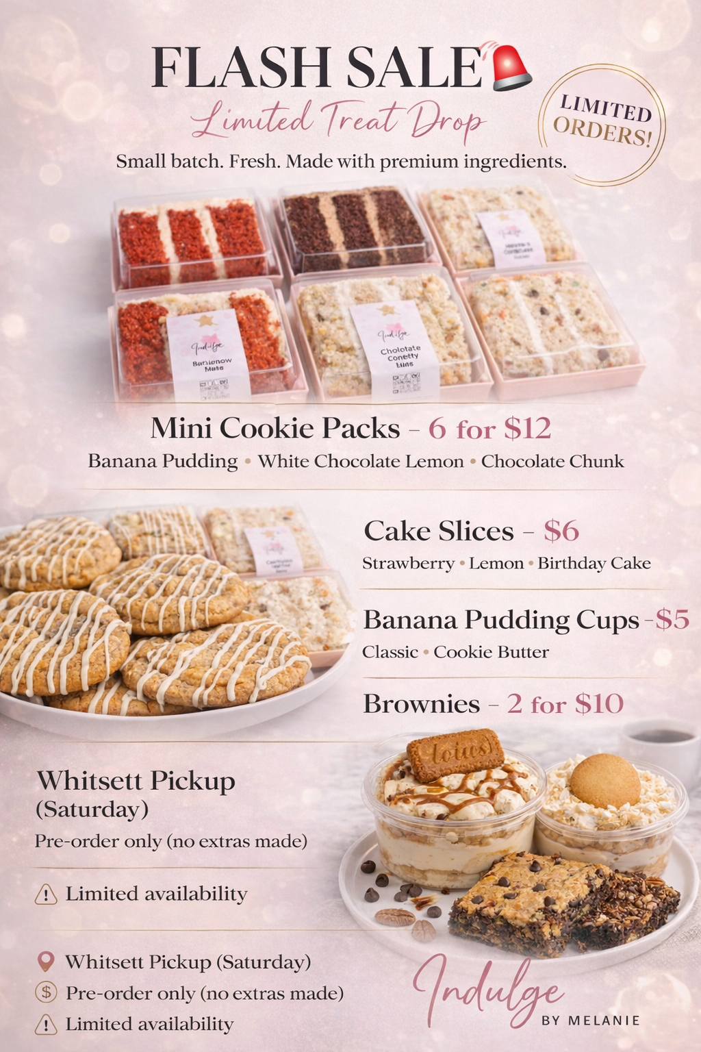 🚨 FLASH SALE – LIMITED ORDERS 🚨 8 oz Banana Pudding $5.00 Flavor: Select Flavor Original Banana Cookie Butter Banana Order Now Brownies $5.00 Flavor: Select Flavor Turtle Brookie Order Now Mini Cookie Packs (2oz cookies) – 6 for $12 $12.00 Flavor: Select Flavor Banana Pudding White Choc Lemon Chocolate Chunk Assorted (2 of each flavor) Order Now Cake Slices *$6 special $6.00 Order Now